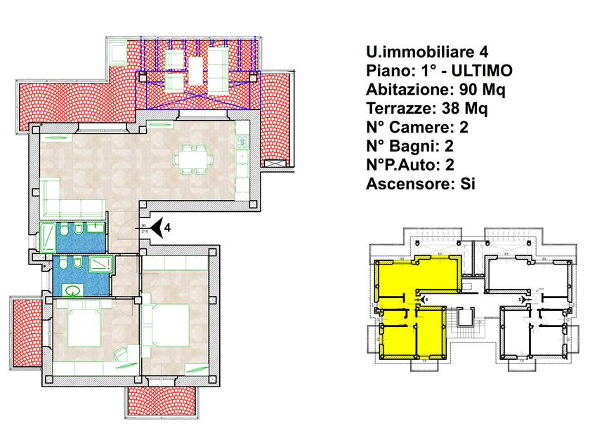 Appartamento sito al piano primo ed ultimo, così composto: ingresso in ampio soggiorno con cucina abitabile a vista, doppi servizi, 2 camere.