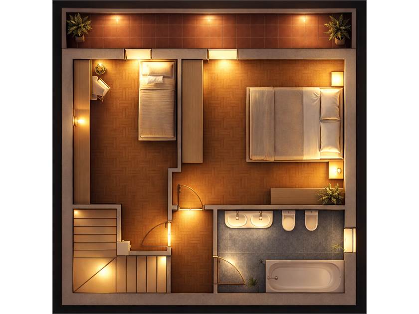 Il piano superiore, collegato da una raffinata scala in marmo, ospita una camera matrimoniale con balcone, una cameretta e un bagno finestrato con vasca.