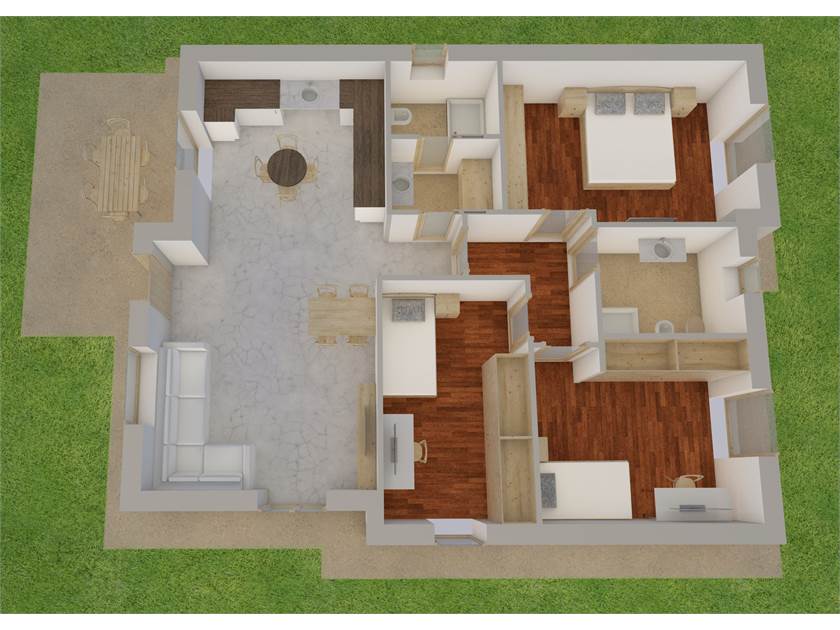 La villa internamente è così distribuita: ingresso in ampio e luminoso soggiorno con cucina a vista, bagno della zona giorno, disimpegno, bagno della zona notte e 3 camere di cui una con cabina armadio.